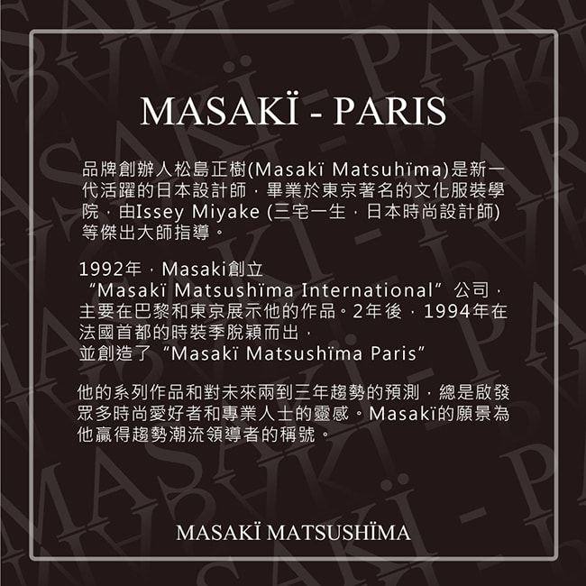 品牌創辦人松島正樹(Masakï Matsuhïma)是新一代活躍的日本設計師,畢業於東京著名的文化服裝學院,由Issey Miyake (三宅一生,日本時尚設計師)等傑出大師指導。1992年,Masaki創立“Masakï Matsushïma International”公司,主要在巴黎和東京展示他的作品。 2年後,1994年在法國首都的時裝季脫穎而出,並創造了“Masakï Matsushïma Paris”。