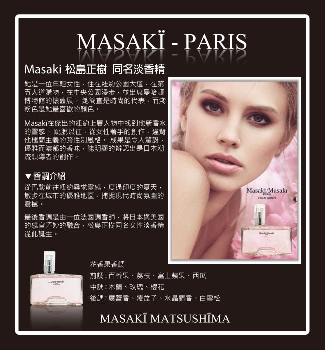 最後香調是由一位法國調香師,將日本與美國的感官巧妙的融合,松島正樹同名女性淡香精從此誕生。