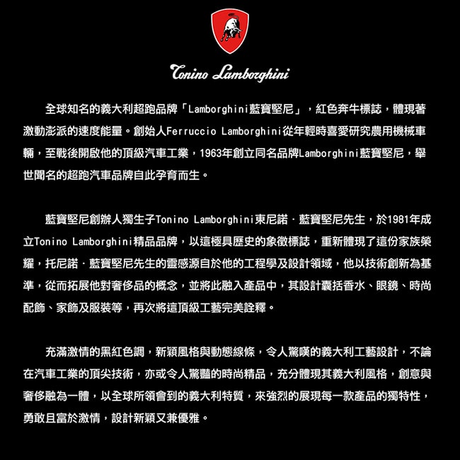藍寶堅尼創辦人獨生子Tonino Lamborghini東尼諾.藍寶堅尼先生,於1981年成立Tonino Lamborghini精品品牌,以這極具歷史的象徵標誌,重新體現了這份家族榮耀,托尼諾.藍寶堅尼先生的靈感源自於他的工程學及設計領域,他以技術創新為基準,從而拓展他對奢侈品的概念,並將此融入產品中,其設計囊括香水、眼鏡、時尚配飾、家飾及服裝等,再次將這頂級工藝完美詮釋。
